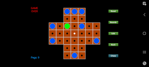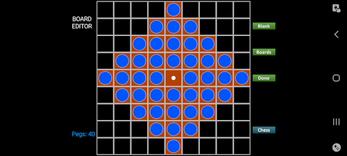 WyeSoft Peg Solitaire also includes a board editor which allows you to create and your own boards, and a save/load feature which allows you to save your games and boards.