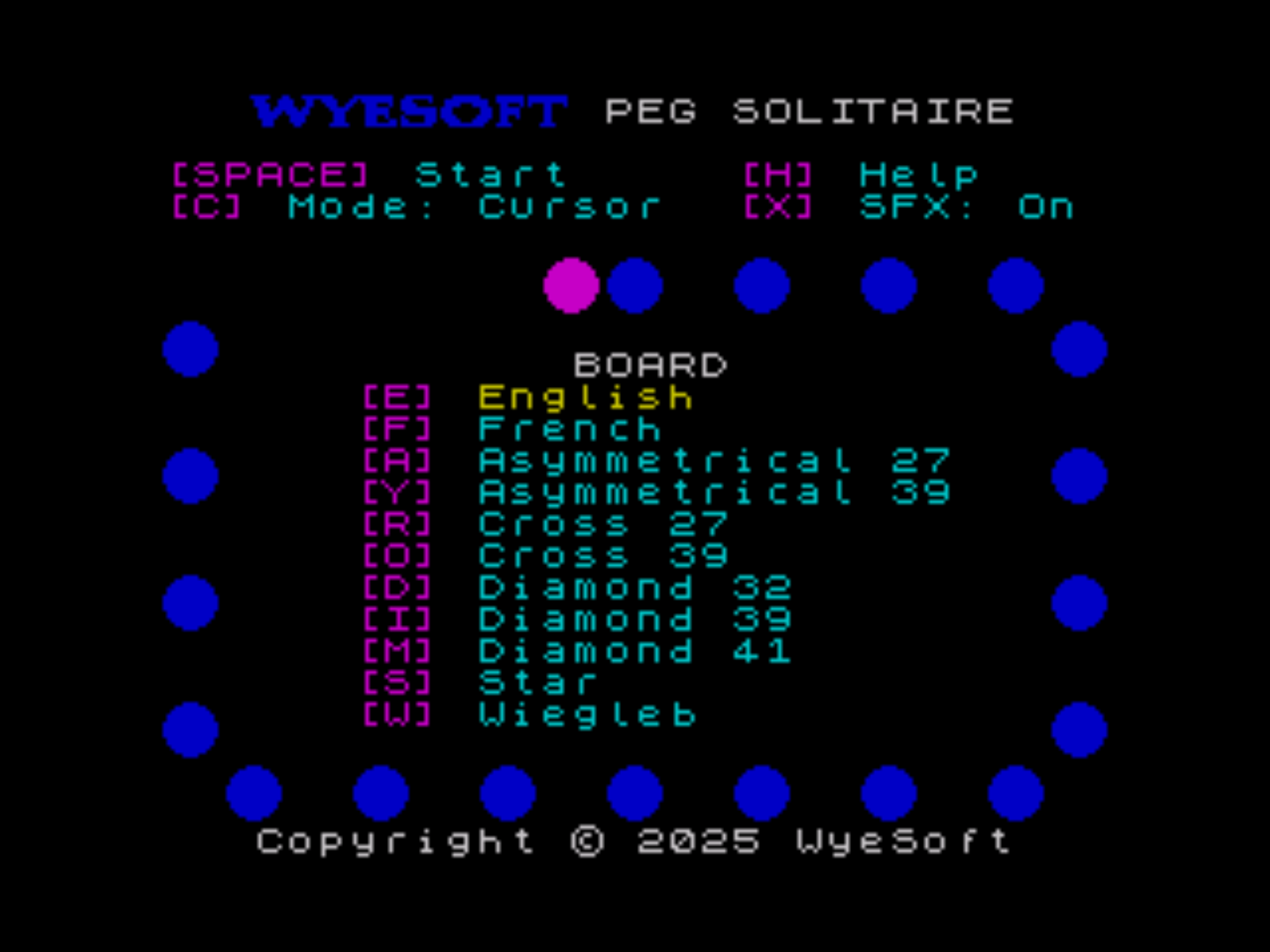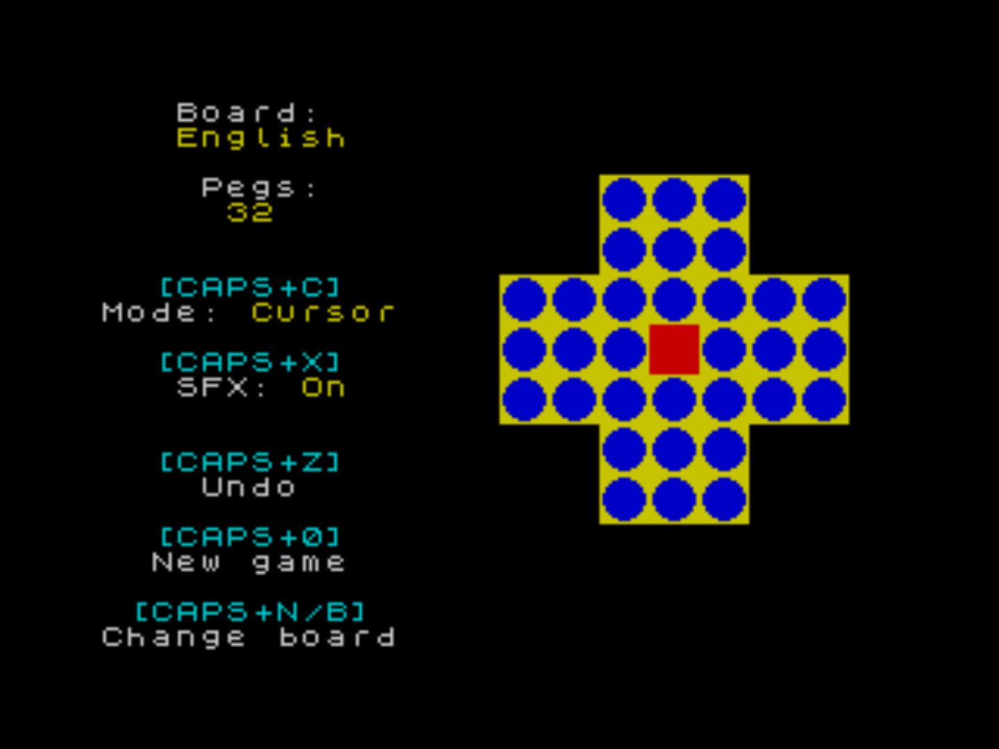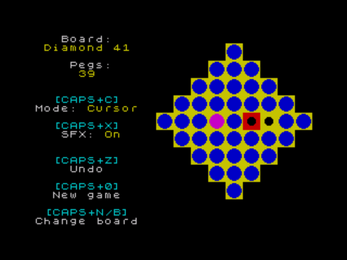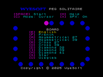 WyeSoft Peg Solitaire is a ZX Spectrum version of the traditional board game, peg solitaire. Players are able to choose from 11 different solitaire boards, including the standard English and French/European boards.