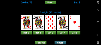 The credits you've earned are saved and loaded between games. The settings screen allows you to customise the number of credits you start with, the lowest card value you need to get a "High Pair" hand, and the payout amounts for each type of hand.