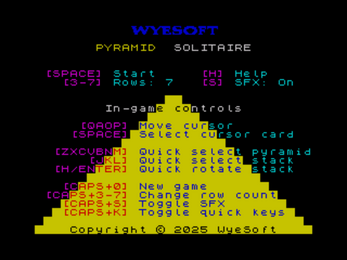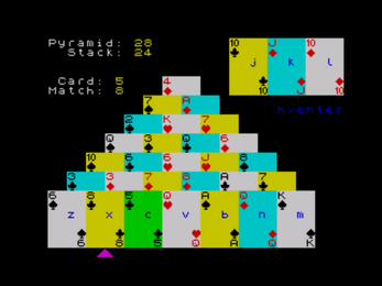 WyeSoft Pyramid Solitaire is a ZX Spectrum version of the single player card game, pyramid solitaire (also known as pyramid patience, or simply pyramid). The aim is to remove pairs of cards whose values add up to 13 to clear the pyramid.