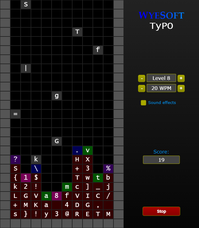 WyeSoft Typo is a falling block typing game, meant to aid in improving your typing speed. Type the characters corresponding to the falling blocks or the top layer of fallen blocks to remove them. Remove all of the fallen blocks to progress.
